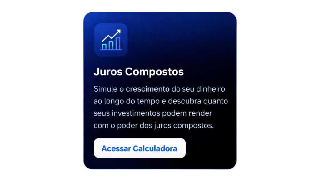 A Calculadora de Juros Compostos permite visualizar como seus investimentos podem crescer ao longo do tempo. Ela mostra o poder dos juros sobre juros, ajudando você a entender quanto um investimento regular pode render no futuro e motivando você a começar a poupar quanto antes.