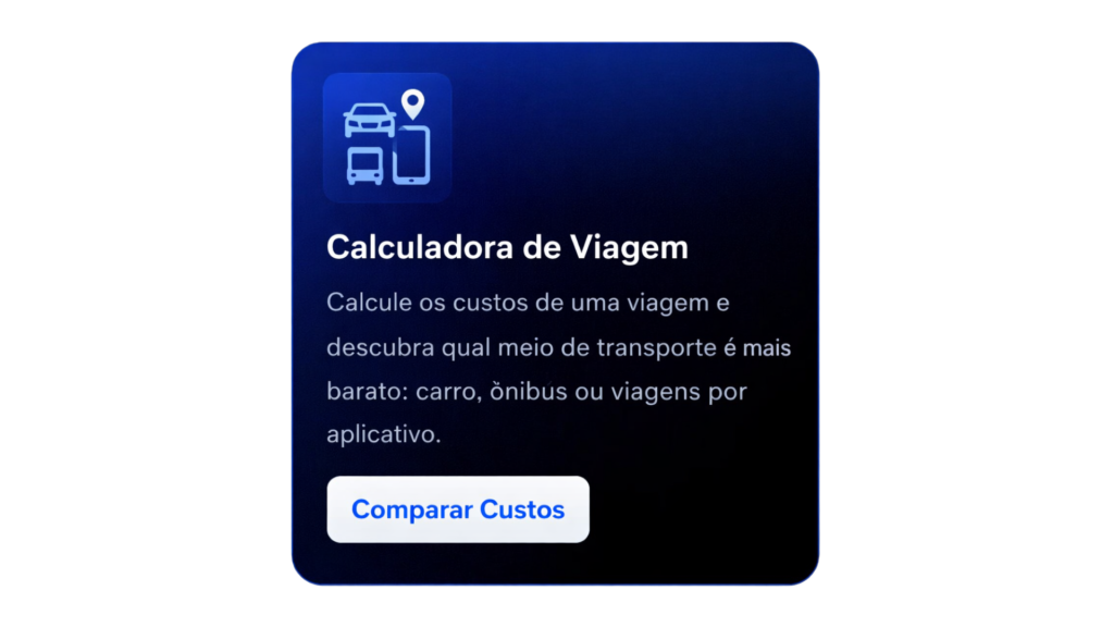 A Calculadora de Viagens foi desenvolvida para quem busca economia, essa calculadora compara três meios de transporte diferentes: usar o carro próprio (considerando gasolina e desgaste do veículo), chamar um Uber ou 99, ou viajar de ônibus. A ferramenta trabalha com estimativas baseadas em médias nacionais de preços, oferecendo uma comparação rápida e prática.